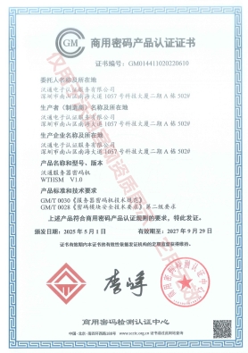 沃通服务器密码机(WTHSM)由沃通CA自主设计开发,严格遵照国密局颁布技术规范,获得国密局颁发《商用密码产品认证证书》,是一款多安全功能、高稳定性、可扩展和快速部署的软硬件集成化安全设备,为应用提供底层的密钥管理和密码计算服务,可以广泛应用于基础信息网络、重要信息系统和工业控制系统,以及面向社会服务的政务信息系统,满足等保、关保对密码应用产品的合规应用要求。